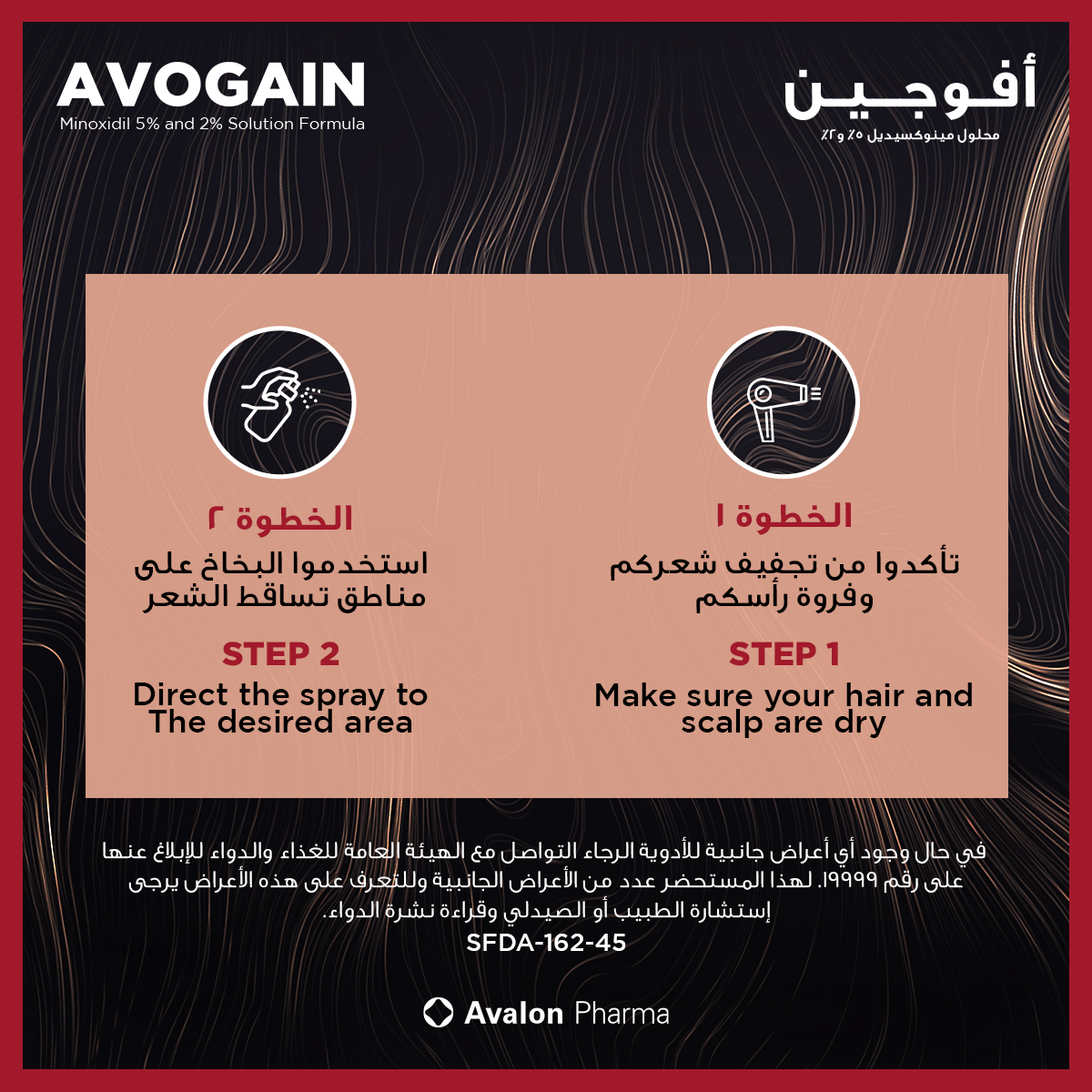إرشادات استخدام افالون افوجين 2 % محلول 50 مل: ضعيه على فروة رأس جافة مرتين يوميًا. وزّعه جيدًا بأصابعك. تجنب استنشاق الرذاذ. استخدمه لمدة لا تقل عن شهرين لرؤية النتائج. استمر في استخدامه للحفاظ على النتائج.