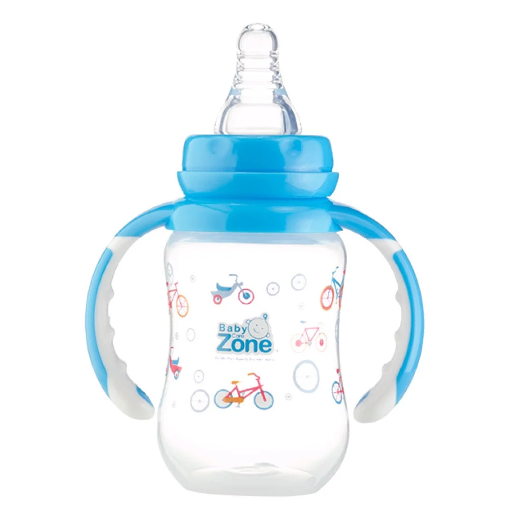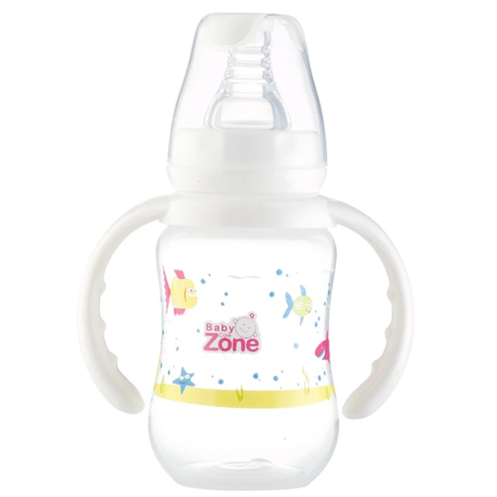 سعة بيبي زون رضاعة بلاستك بيدين هي 120 مل.