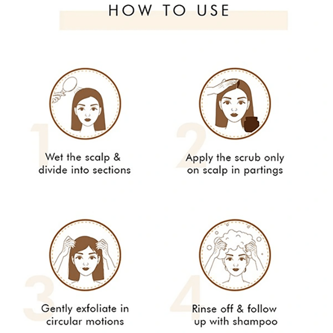 - خذ كمية مناسبة من المقشر ودلك فروة رأسك بلطف بحركات دائرية لمدة 2-3 دقائق.