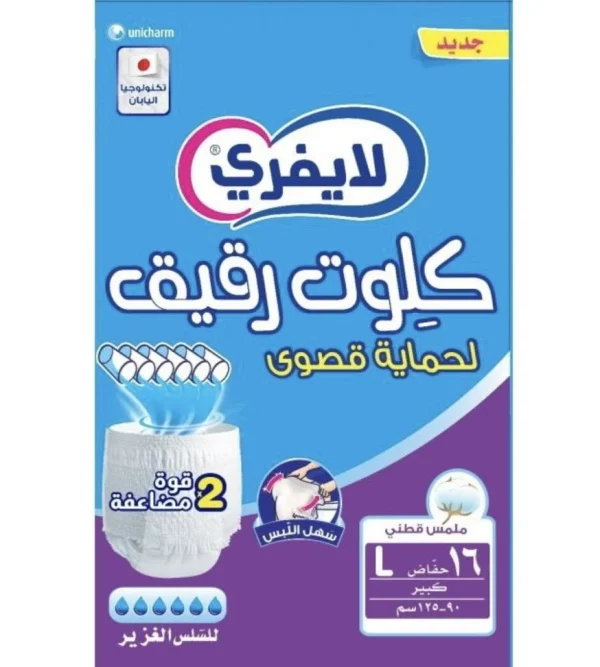 تعتبر لايفري حفائظ لكبار السن كلوت كبير بمقاسها الكبير (L) الخيار المثالي لمن يبحث عن الجمع بين الحماية الفائقة والراحة اليومية، حيث تأتي العبوة بـ 16 قطعة مصممة بعناية لتوفر للمستخدمين من الرجال والنساء شعوراً بالثقة التامة بفضل الخصر المطاطي المرن الذي يسهل ارتداؤه كالملابس الداخلية تماماً.