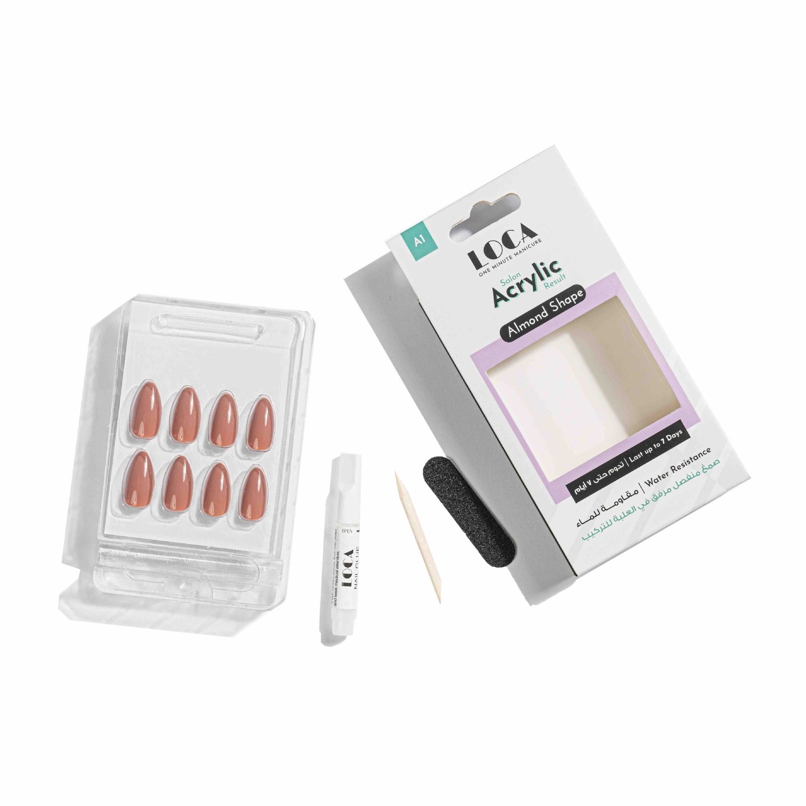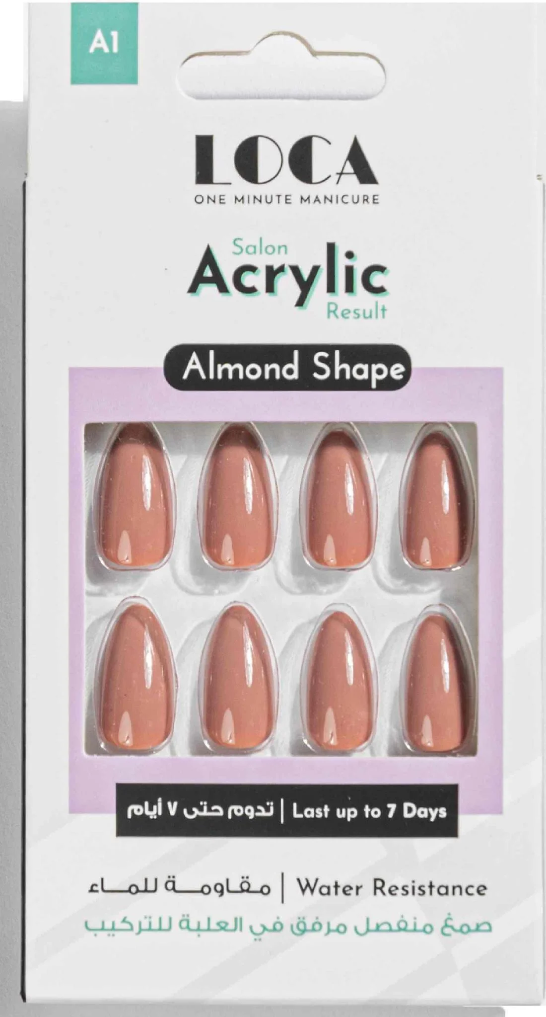 أظافر أكريليك لوكا A1 بشكل اللوز بلون النود. مرونة فائقة، مقاس مثالي، نتيجة صالون احترافية.
