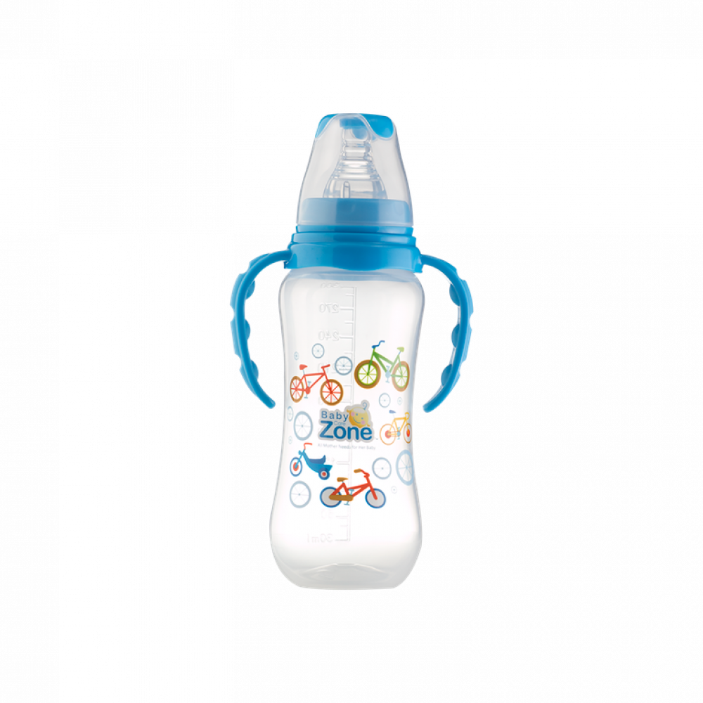 سعة بيبي زون رضاعة بلاستيك بيدين هي 300 مل.