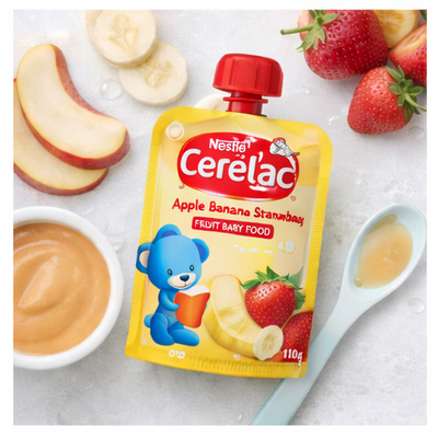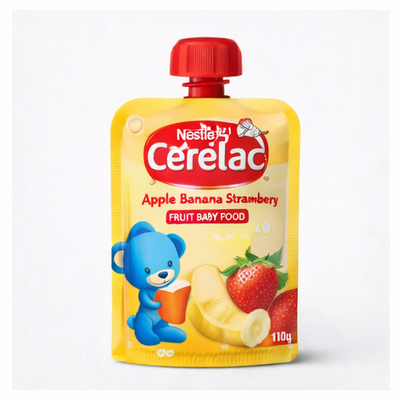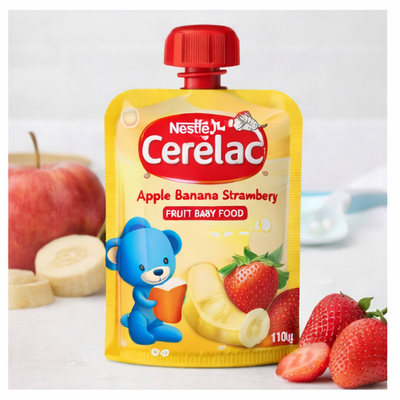 سيريلاك طعام أطفال بالتفاح والموز والفراولة 110 جم وجبة فواكه مهروسة جاهزة، مصممة خصيصًا لتناسب معدة الطفل الحساسة وتساعد على تعويده على مذاق الفواكه الطبيعي.
