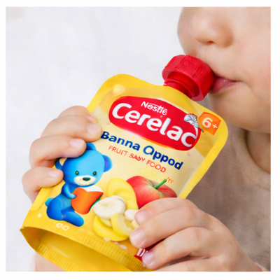 يحتوي على مزيج من الموز والتفاح بقوام ناعم وسهل البلع، مما يساعد الطفل على التعود على النكهات الجديدة مع سهولة الهضم، ويُعد خيارًا مناسبًا كوجبة خفيفة أو ضمن النظام الغذائي اليومي.