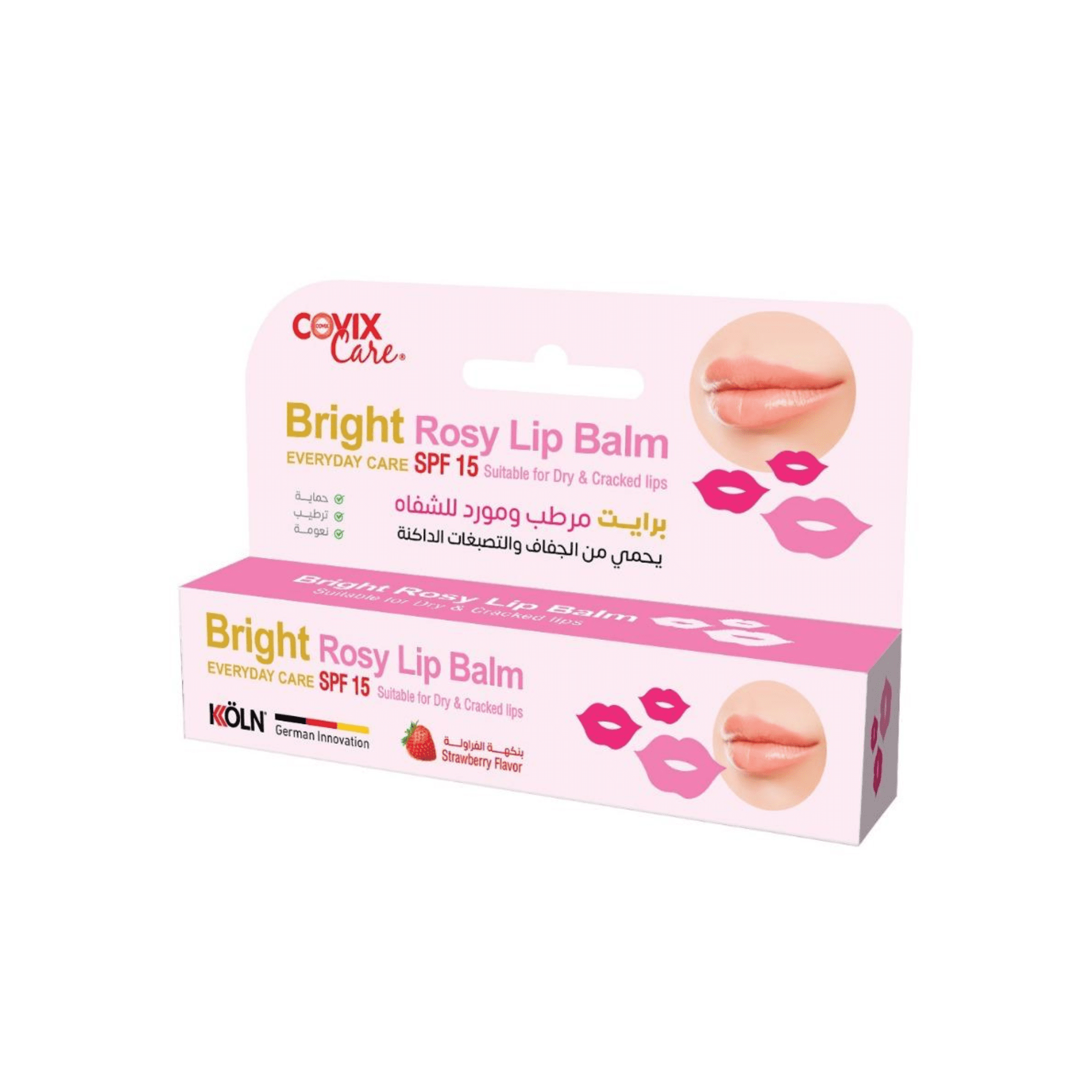 كوفيكس كير برايت مرطب ومورد للشفاه بنكهة الفراولة 15 مل هو بلسم شفاه بتركيبة مغذية بيساعد على ترطيب الشفاه ومنحها لون وردي طبيعي مع رائحة الفراولة المنعشة.