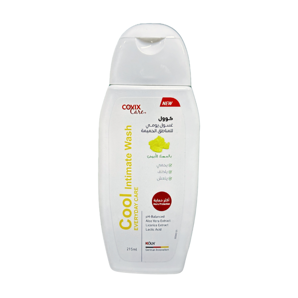 كوفيكس كير كول غسول يومي للمناطق الحساسة بالمسك الأبيض 215 مل هو غسول لطيف بتركيبة منعشة يحتوي على المسك الأبيض، بيساعد على تنظيف المناطق الحساسة بلطف مع منح رائحة أنثوية مميزة وإحساس طويل بالنظافة والانتعاش.