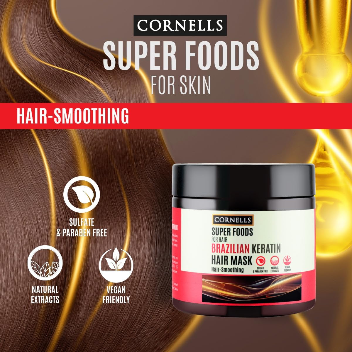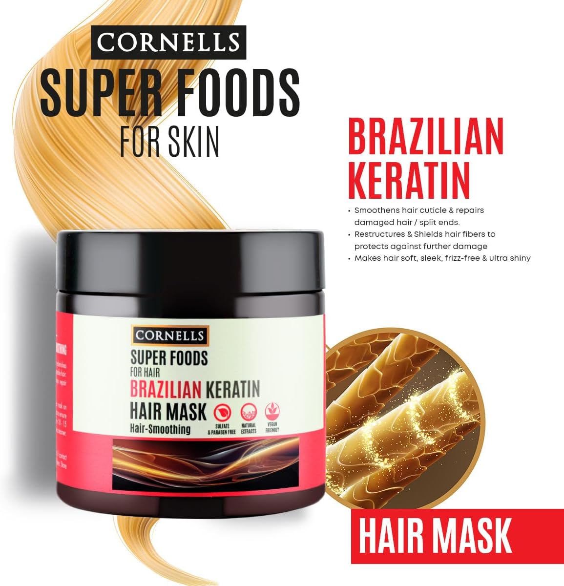 هو ماسك شعر مغذي من مجموعة Cornells Superfoods غني بالكيراتين البرازيلي، مصمم لإصلاح الشعر التالف ومنحه نعومة ولمعان مع تقليل الهيشان.