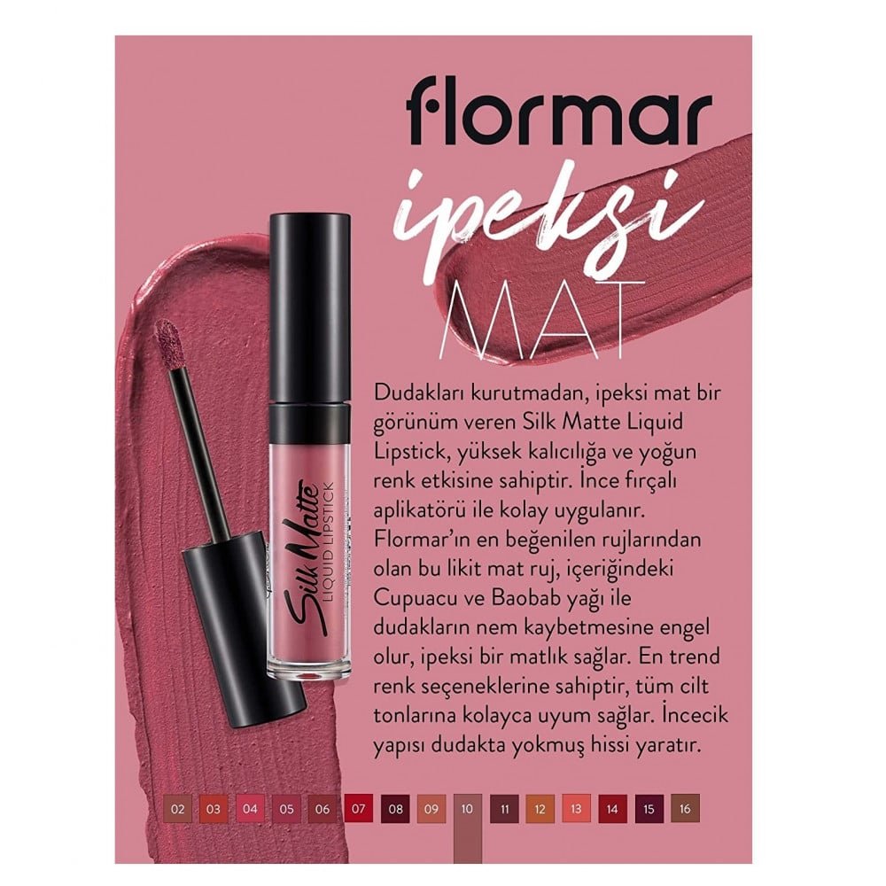 روج فلورمار سيلك مات سائل بلون وردي أنيق. تركيبة مطفية غنية بالزيوت المرطبة، تمنحك إطلالة جذابة وثابتة.
