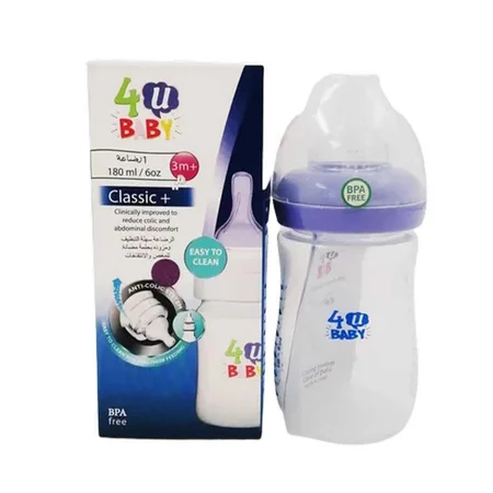 فور يو بيبي رضاعة بلاستيك كلاسيك 180 مل لأنها 180 مل مناسبة للرضعات المتوسطة ومريحة في الحمل.