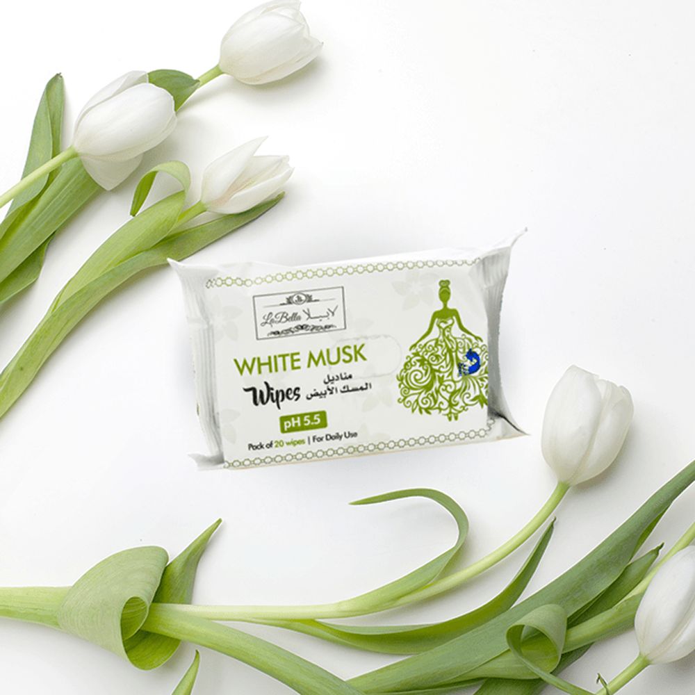 تركيبة لابيلا مناديل المسك الأبيض 20 منديل تساعد على إزالة الروائح ومنح رائحة خفيفة لطيفة.