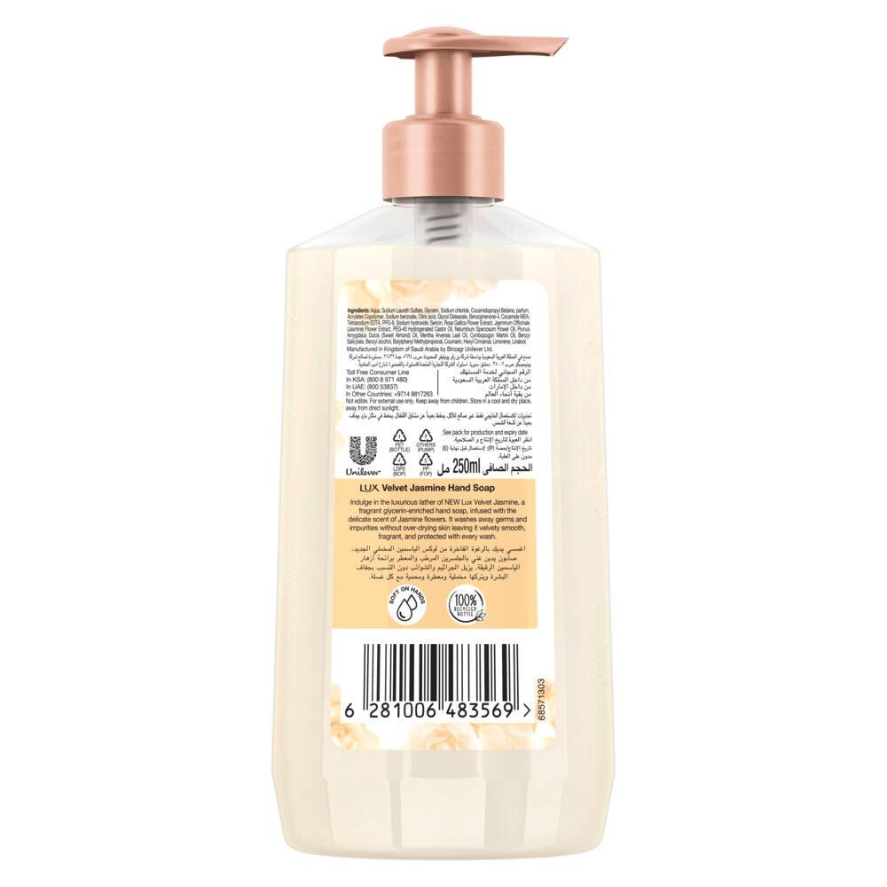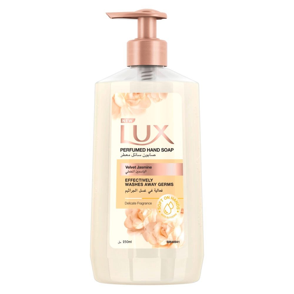 لوكس صابون سائل لمسة مخملية: رغوة غنية تعطر وترطب بشرتك بنعومة الحرير. برائحة الياسمين وزيت اللوز.