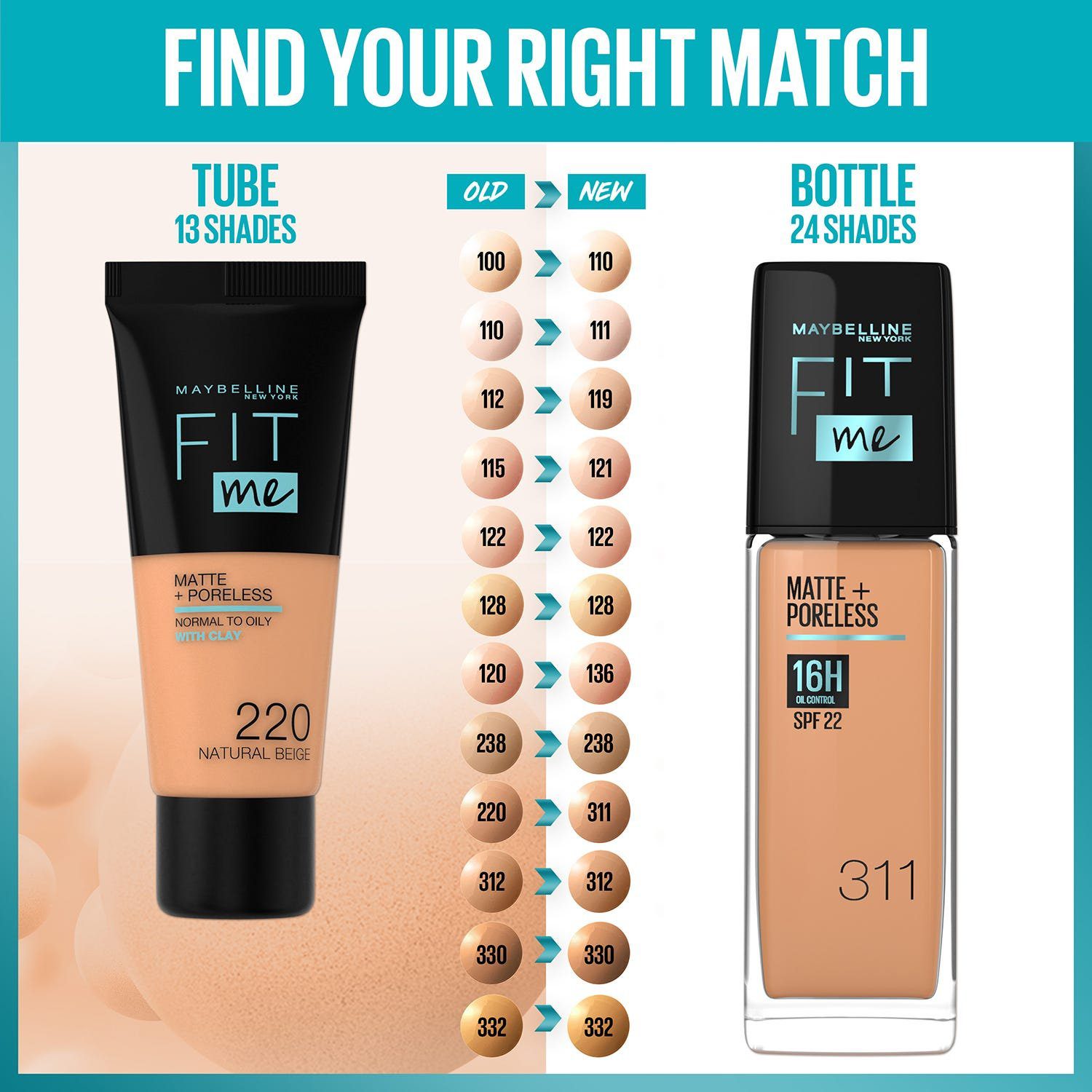 اكتشف كريم أساس فيت مي مات اند بورلس من ميبيلين، يمنحك بشرة مات طبيعية 16 ساعة مع SPF22. مثالي للبشرة الدهنية.