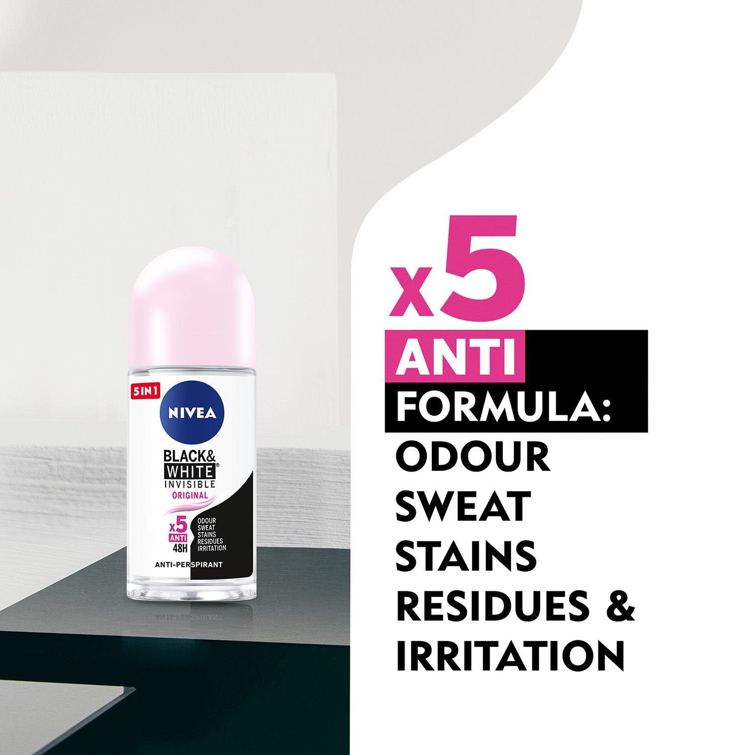 تركيبة مبتكرة 5 في 1: ضد الرائحة، ضد التعرق، ضد البقع، ضد الرواسب، ضد التهيج.