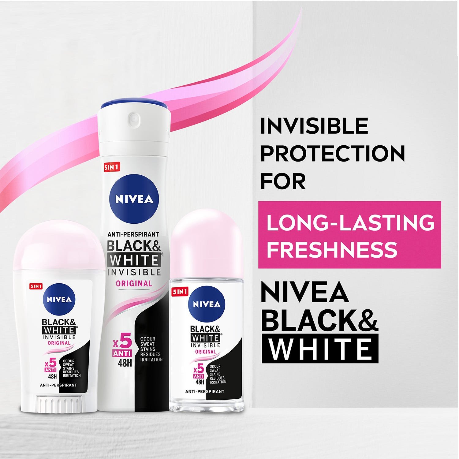 حماية 48 ساعة ضد التعرق والبقع مع نيفيا انفيسيبل بلاك & وايت. يبقى الأسود أسود والأبيض أبيض.