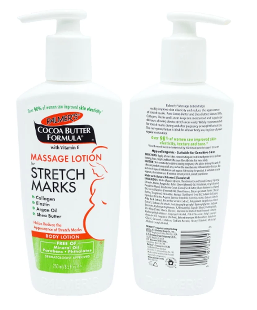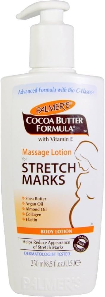 لوشن بالمرز لتقليل ظهور علامات التمدد، غني بزبدة الكاكاو وفيتامين E. آمن للحوامل من الشهر الرابع.