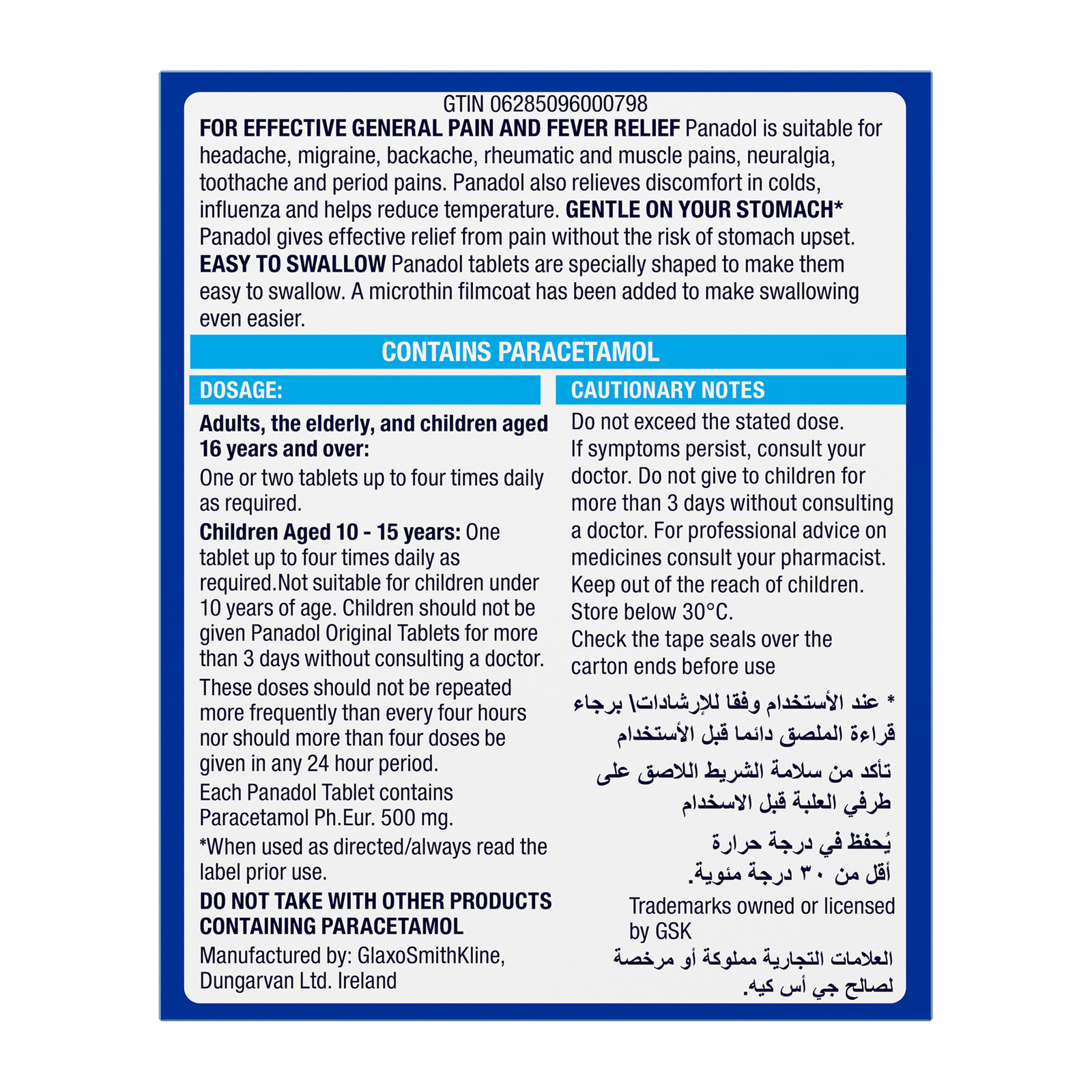 بانادول، مسكن فعال للألم والحمى. يخفف الصداع، الصداع النصفي، آلام الظهر، الروماتيزم، آلام العضلات، الألم العصبي، آلام الأسنان، وآلام الدورة الشهرية. يهدئ أعراض نزلات البرد والإنفلونزا. لطيف على المعدة عند الاستخدام حسب التعليمات. سهل البلع بفضل طبقة الميكروثين.