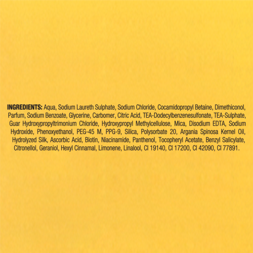 ماء كبريتات لوريث الصوديوم ثنائي ميثيكونول كوكاميدوبروبيل بيتين كلوريد الصوديوم عطر كاربومير هيدروكسيد الصوديوم ثنائي الصوديوم EDTA TEA-Dodecylbenzenesulfonate Guar Hydroxypropyltrimonium Chloride TEA-Sulfate Citric Acidone Amodima -45M فينوكسييثانول بنزوات الصوديوم Climbazole زنك غلوكونات ليسين حمض الهيدروكلوريك Trideceth-12 كلوريد السيتريمونيوم PPG-9 نترات المغنيسيوم ثنائي ميثيل بالميتامين ميثيل كلورويسوثيازولينون سيلكا BHT كلوريد المغنيسيوم ميثيل الأثيل ميثيل Butylphenyl Methylpropional Linalool Citronellol Hexyl Cinnamal Benzyl Salicylate Alpha-Isomethyl Ionone CI 77891.