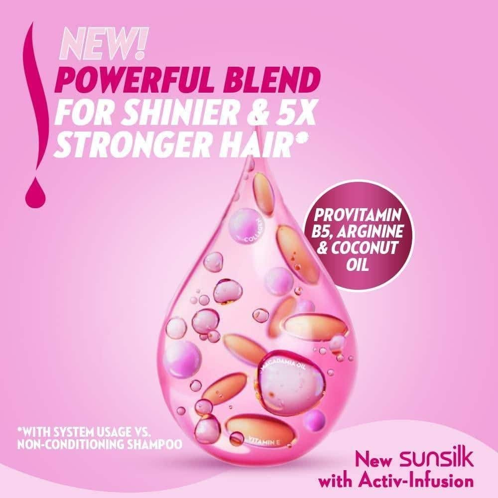 ضعي كمية مناسبة من صانسيلك بلسم قوة ولمعان 340 مل على شعركِ، مع التركيز على الأطراف.