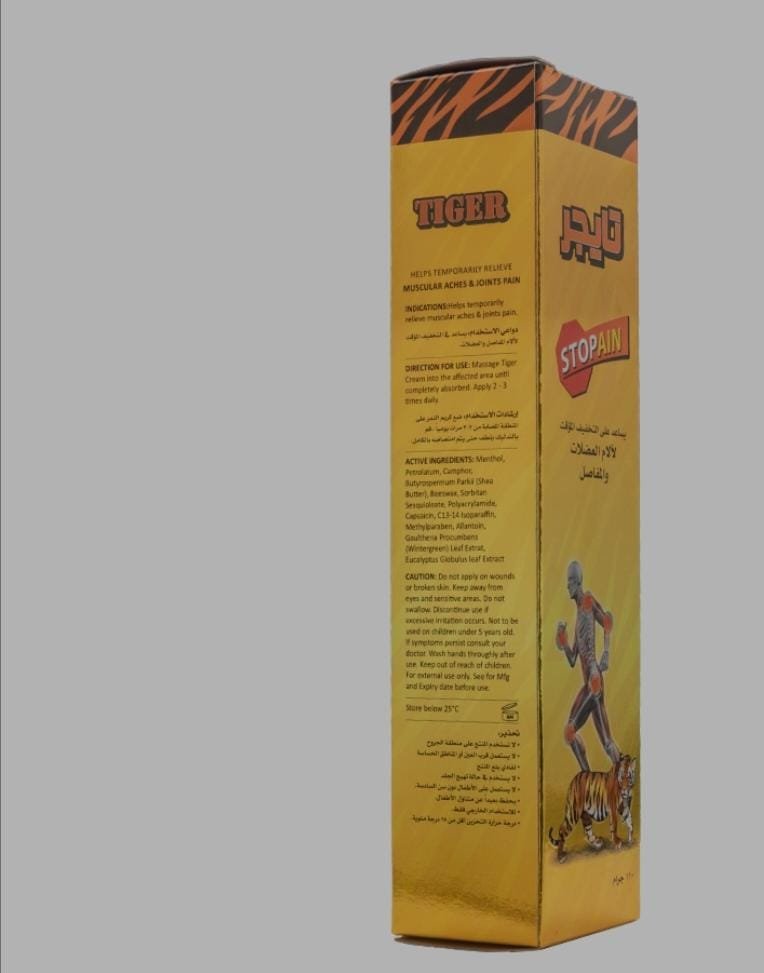 تايجر كريم النمر يوفر تخفيفًا فعّالًا ومستدامًا لآلام العضلات والمفاصل. يستخدم خارجيًا، يُطبق مرتين إلى ثلاث مرات يوميًا. آمن للاستخدام البالغين. اكتشف الراحة الفورية!